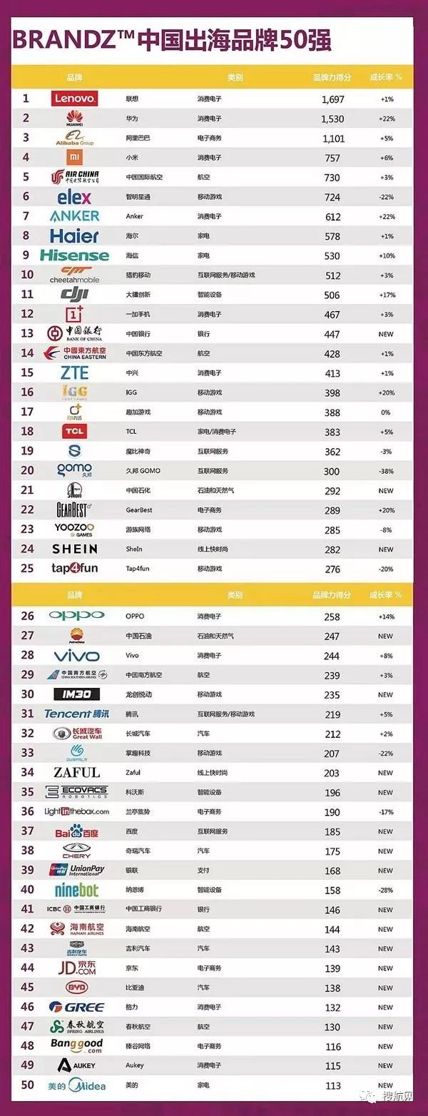 2月6日,“2018年中国出海最著名的50个品牌”揭晓。在全球七个国家调查了近40万名消费者后,基于谷歌大数据和品牌研究模型计算出的“品牌力”得出。最为海外消费者所熟知的中国品牌前三甲依次是联想、华为和阿里巴巴。